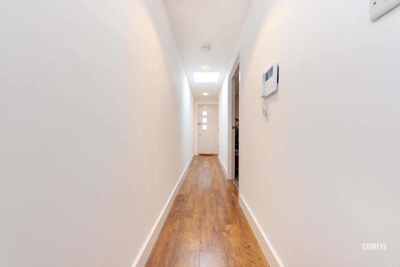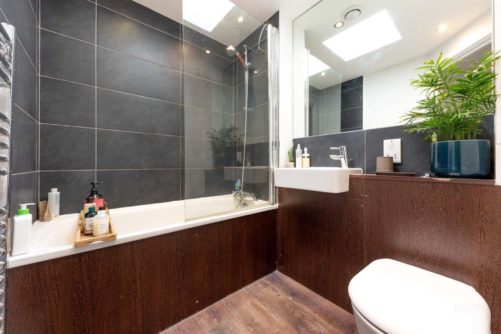 Offering a bright open plan living area with fully fitted modern kitchen, laminate flooring and large window looking out towards the roof terrace, stylish bathroom suite with skylight and rear bedroom with built in wardrobe and space for desk.