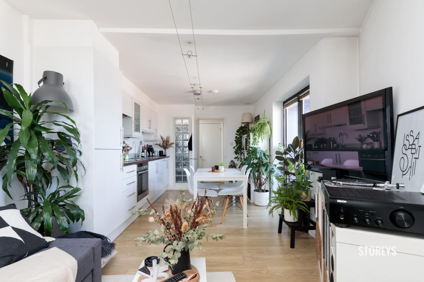 The property features a stylish open-plan living space with a modern fitted kitchen (including dishwasher), wood flooring throughout, and direct access onto a private balcony. There is a well-proportioned double bedroom with storage and a contemporary double-sized shower room.