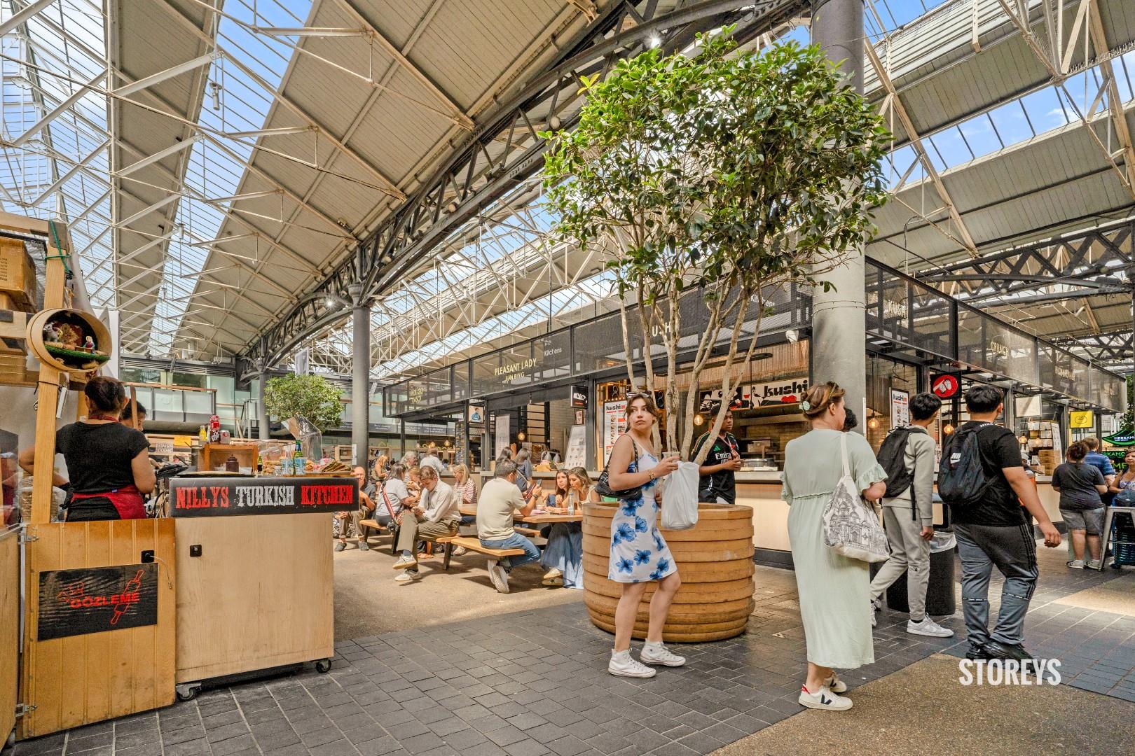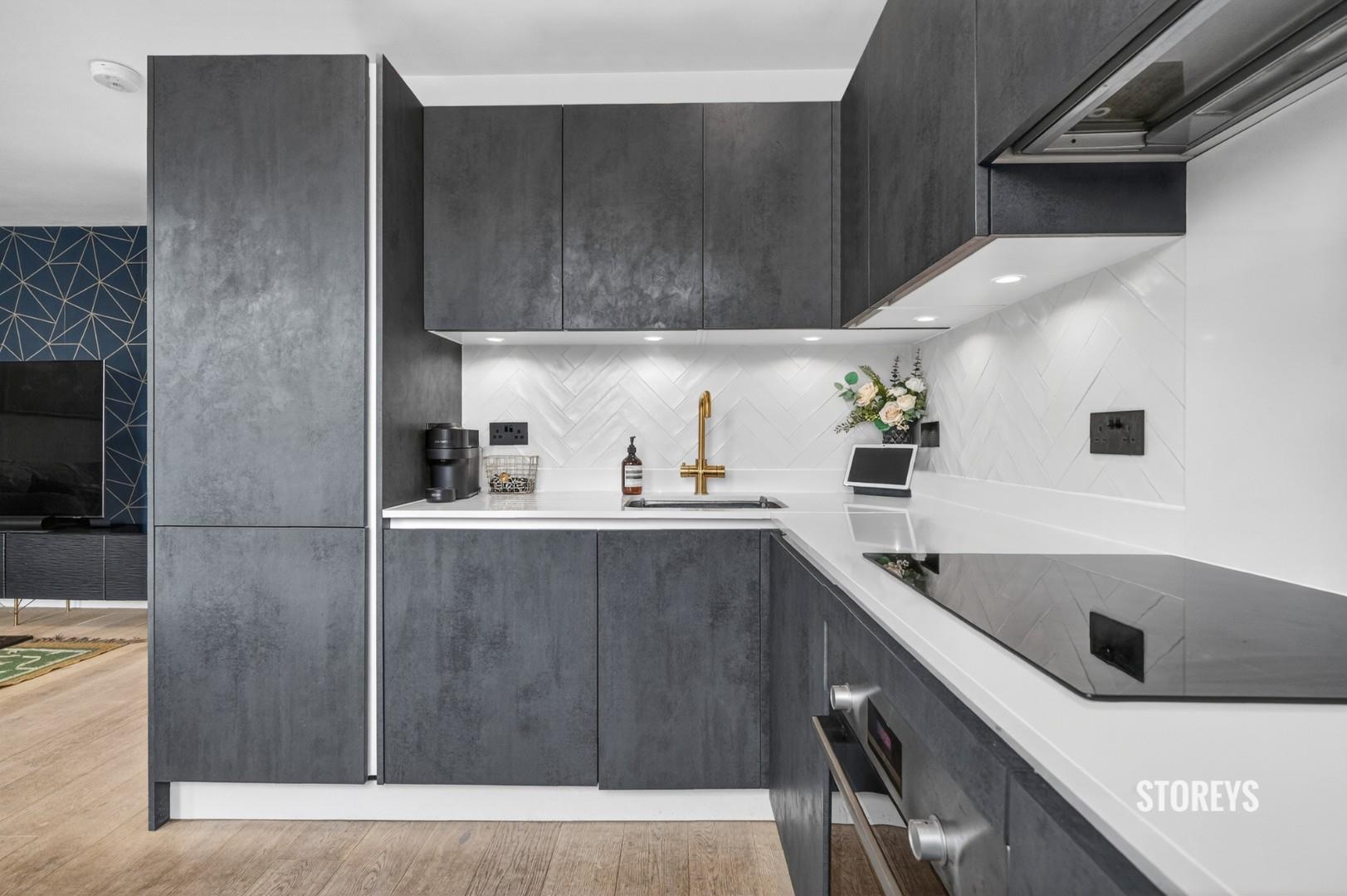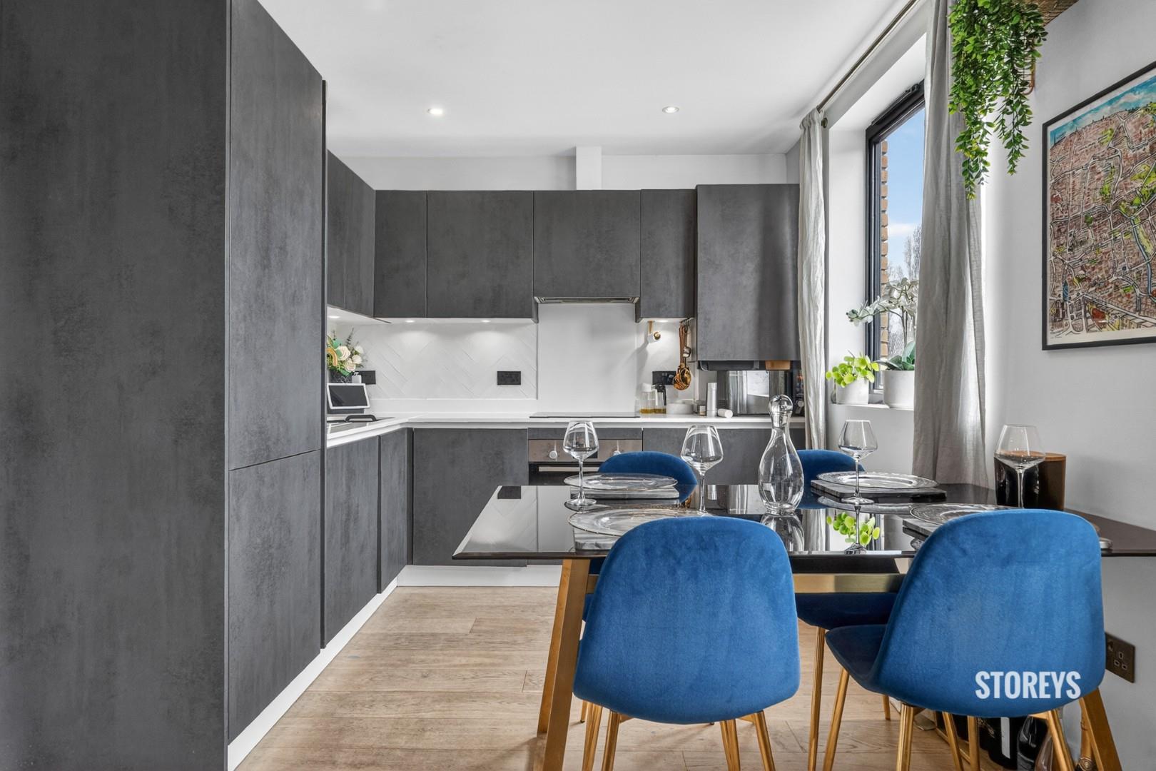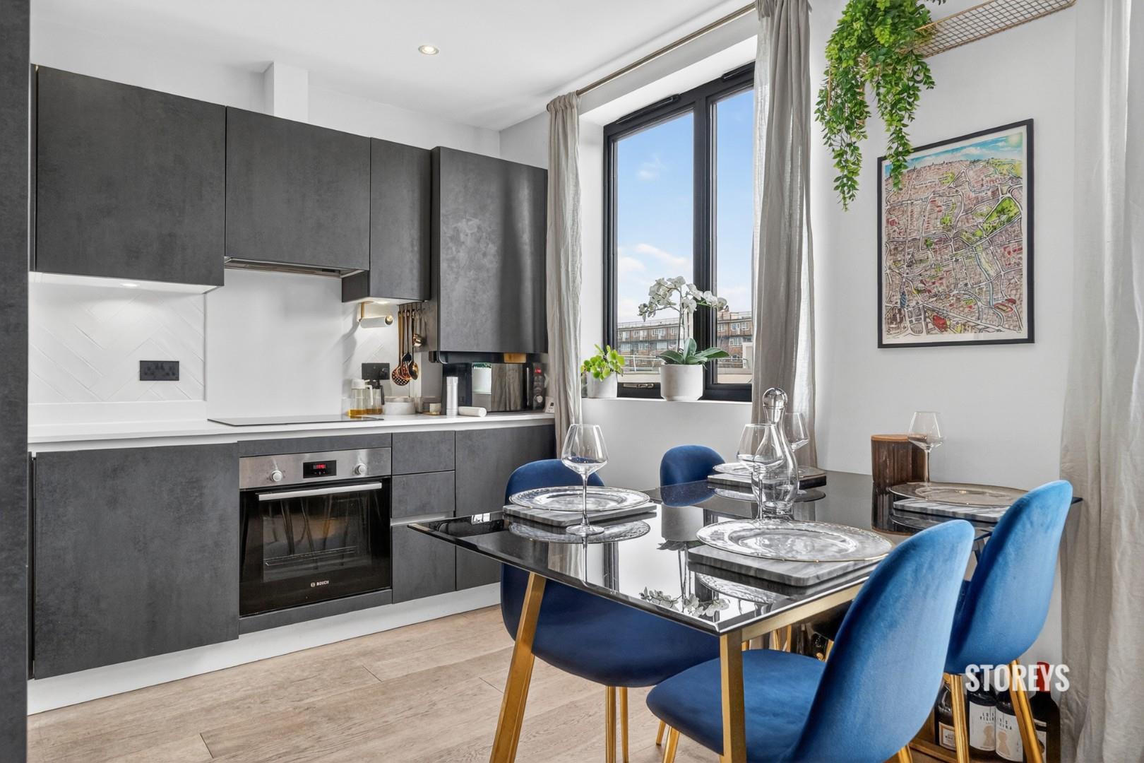 Immaculately maintained by the current owners, the apartment enjoys a rare dual east–west aspect, creating excellent natural light throughout the day with views towards Pollard Square. The accommodation centers around a bright open-plan kitchen, living and dining space featuring engineered wood flooring, contemporary concrete-effect cabinetry, composite stone worktops and integrated Bosch appliances.